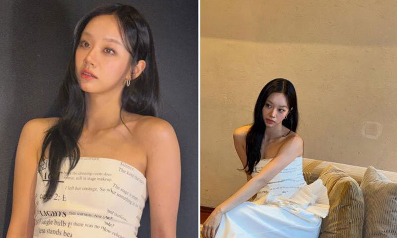 사진 속 혜리는 영문 텍스트가 불규칙하게 프린트된 스트랩리스 튜브 톱을 착용했다. 허리 라인에는 화이트 플리츠 장식이 풍성하게 퍼져 허리를 강조하면서 조형적인 실루엣을 만들어냈다.