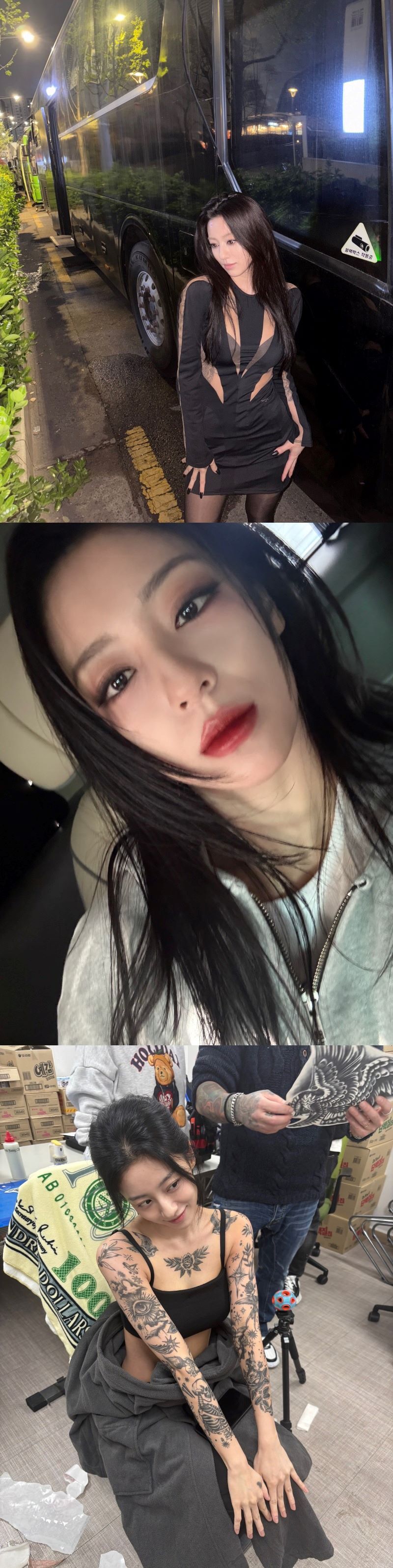 특히 시선을 끄는 것은 양팔을 가득 채운 슬리브 타투와 가슴 중앙의 정교한 타투다. 강민아는 이전에도 자신의 계정에 ‘지나’라는 글과 함께 타투 분장을 받는 사진을 올린 바 있다. 대기실에서 찍은 것 같은 사진에서 강민아는 빈티지하면서도 화려한 도안의 타투를 드러내 살아 있는 예술 작품 같은 우아함을 보였다.