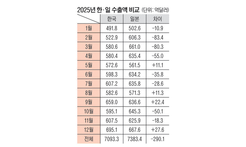 수출 규모 확대와 함께 일본과의 격차도 역대 최소 수준으로 줄었다. 지난해 일본 수출은 7383억4000만 달러(약 1114조9000억원)로, 양국 간 격차는 약 290억 달러까지 좁혀졌다. 월별 기준으로도 한국은 지난해 5월과 8월, 9월, 12월 등 네 차례 일본을 앞선 바 있다. 하반기 누적 기준에서도 격차를 크게 줄였다.