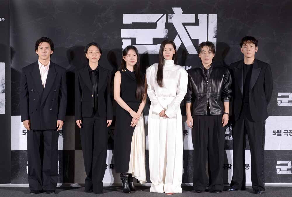 배우 고수, 김신록, 신현빈, 전지현, 구교환, 지창욱(왼쪽부터)이 6일 서울 용산구 CGV용산점에서 열린 영화'군체(감독 연상호)'제작발표회에서 포즈를 취하고 있다. 영화'군체(감독 연상호)'는 정체불명의 감염 사태로 봉쇄된 건물 안, 고립된 생존자들이 예측할 수 없는 형태로 진화하는 감염자들에 맞서 벌이는 사투를 그린 영화로 전지현, 구교환, 지창욱, 신현빈, 김신록 등이 출연한다. 사진=김두홍 기자 kimdh@sportsworldi.com
