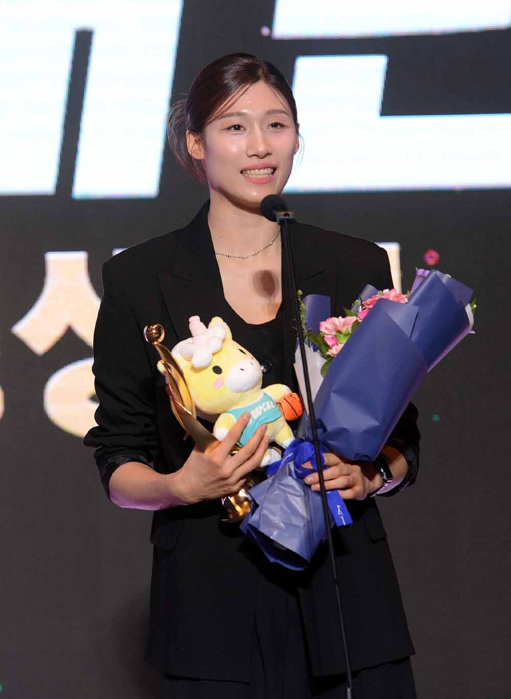 여자프로농구 삼성생명 이해란이 6일 서울 용산구 서울드래곤시티에서 열린 '2025-2026 여자프로농구 정규리그 시상식'에서 우수수비선수상 수상 후 소감을 발표하고 있다. 사진=김두홍 기자 kimdh@sportsworldi.com