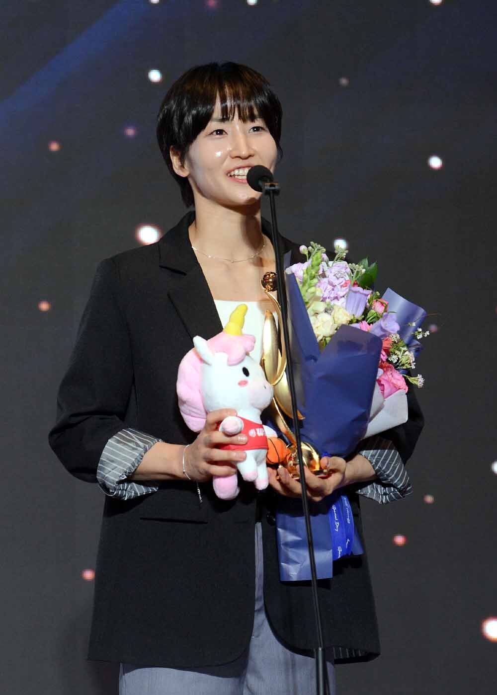 여자프로농구 하나은행 이이지마 사키가 6일 서울 용산구 서울드래곤시티에서 열린 '2025-2026 여자프로농구 정규리그 시상식'에서 아시아쿼터선수상 수상 후 소감을 발표하고 있다. 사진=김두홍 기자 kimdh@sportsworldi.com