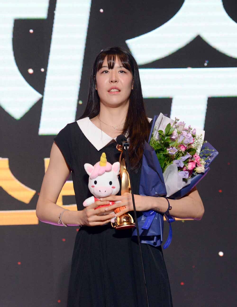 여자프로농구 KB스타즈 박지수가 6일 서울 용산구 서울드래곤시티에서 열린 '2025-2026 여자프로농구 정규리그 시상식'에서 베스트5 센터상 수상 후 소감을 발표하고 있다. 사진=김두홍 기자 kimdh@sportsworldi.com