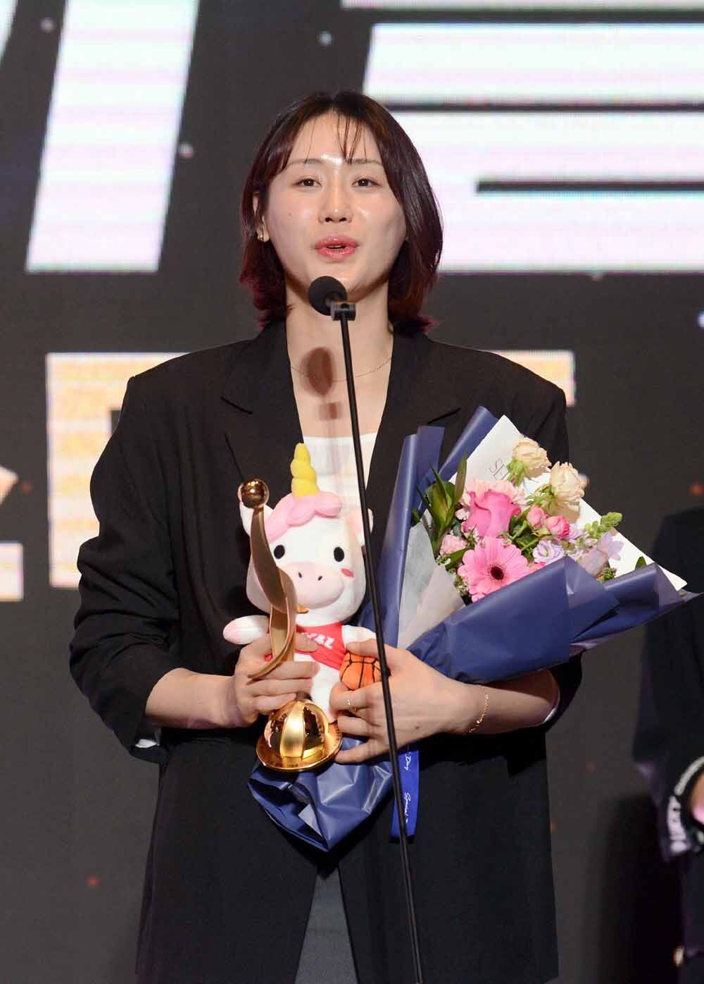 여자프로농구 KB스타즈 강이슬이 6일 서울 용산구 서울드래곤시티에서 열린 '2025-2026 여자프로농구 정규리그 시상식'에서 베스트5 포워드상 수상 후 소감을 발표하고 있다. 사진=김두홍 기자 kimdh@sportsworldi.com
