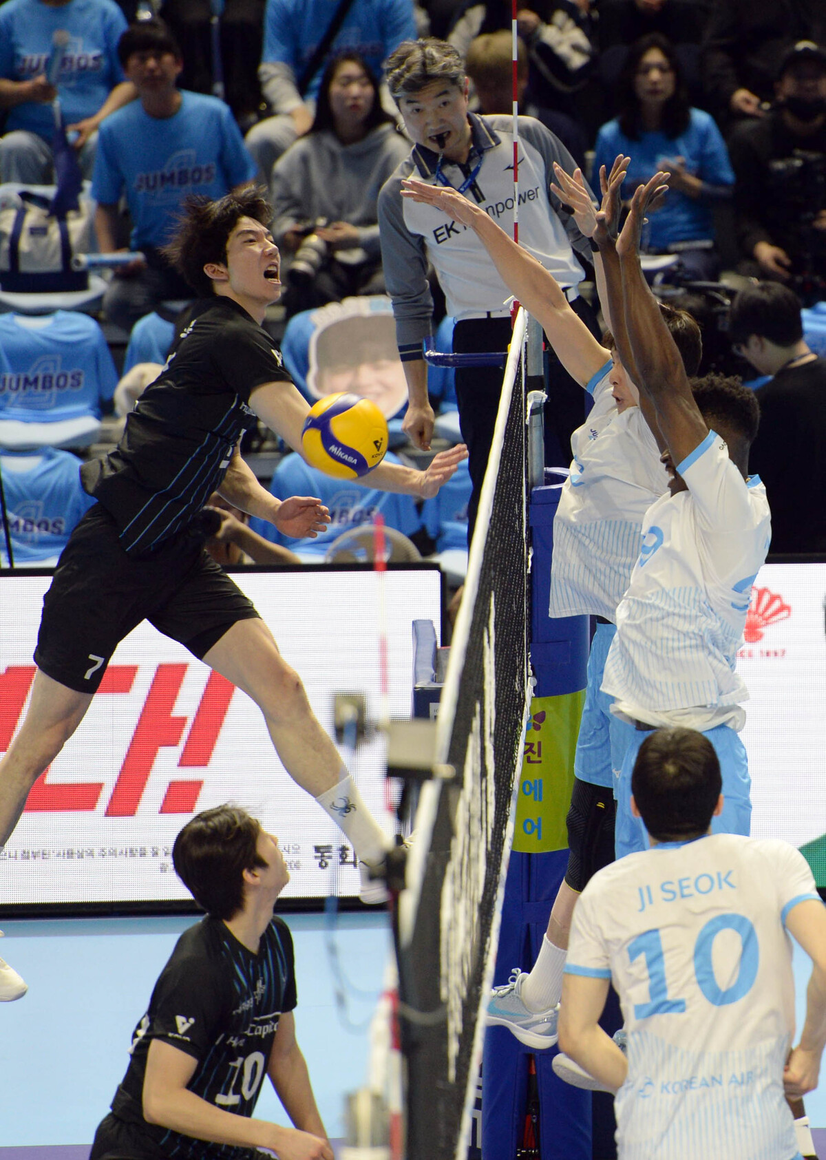 프로배구 대한항공의 한선수가 10일 인천 계양체육관에서 열린 2025-2026 V-리그 남자부 챔피언결정전 5차전 현대캐피탈과 경기에서 상대 허수봉의 스파이크 공격을 블로킹하고 있다.
