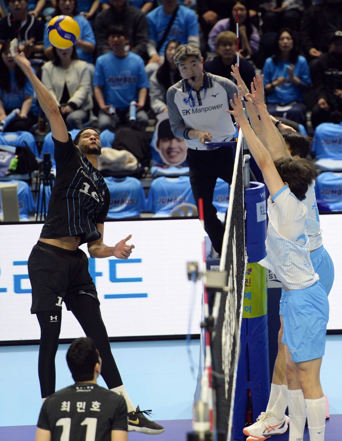 프로배구 현대캐피탈의 레오가 10일 인천 계양체육관에서 열린 2025-2026 V-리그 남자부 챔피언결정전 5차전 대한항공과의 경기에서 상대 블로킹을 향해 스파이크 공격을 하고있다.