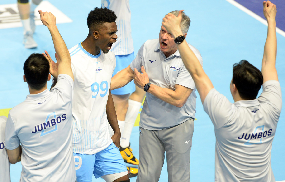 프로배구 대한항공의 마쏘(99번)가 10일 인천 계양체육관에서 열린 2025-2026 V-리그 남자부 챔피언결정전 5차전 현대캐피탈과 경기에서 득점에 성공한 뒤 헤난 감독과 하이파이브를 하고 있다.