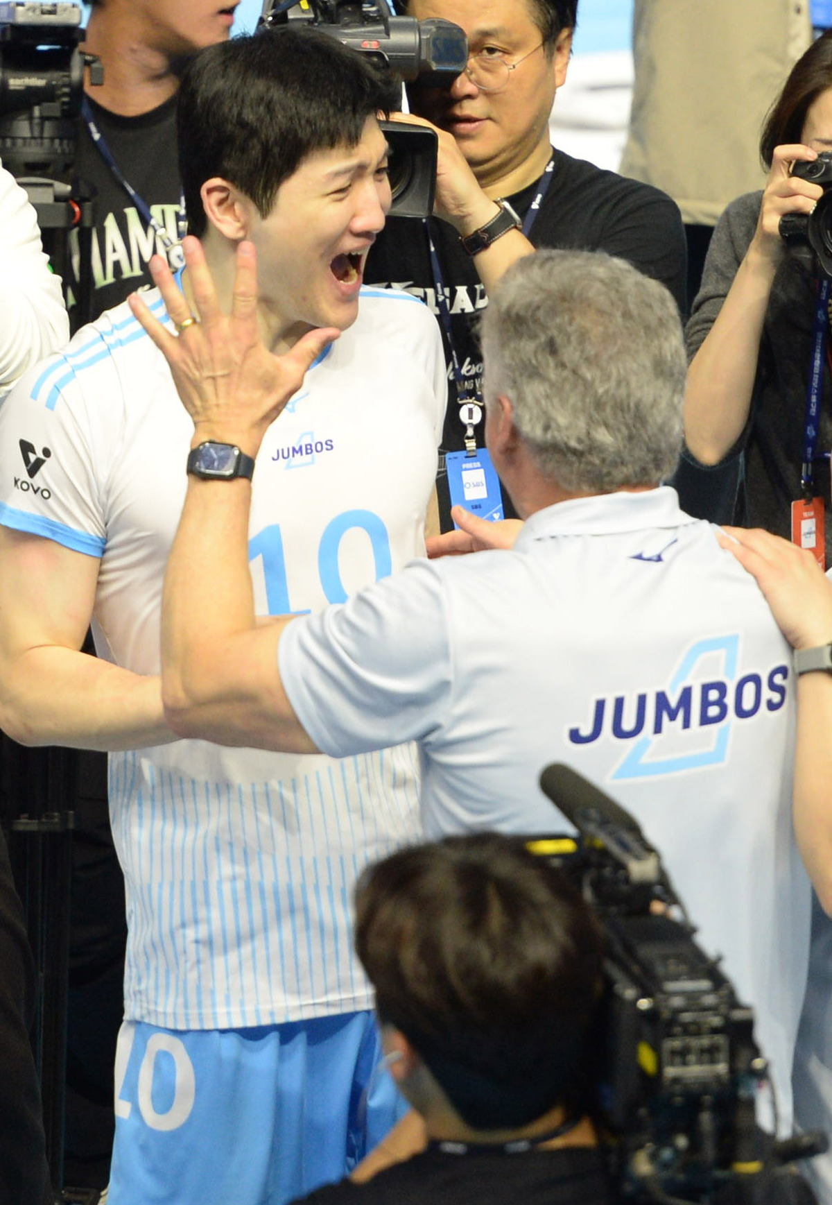 프로배구 대한항공의 정지석(10번)이 10일 인천 계양체육관에서 열린 2025-2026 V-리그 남자부 챔피언결정전 대캐피탈과 경기에서 승리하며 우승을 확정 짖고 헤난 감독과 기븜을 나누고 있다.