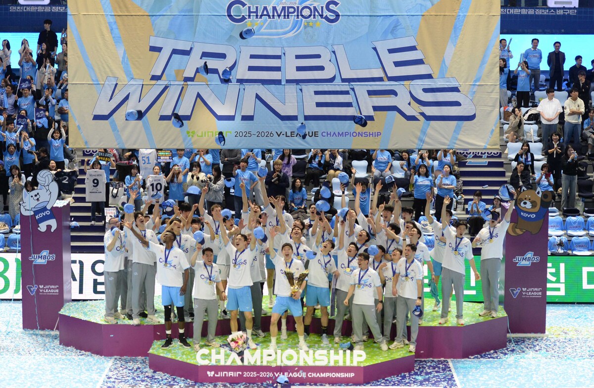 프로배구 대한항공의 인천 계양체육관에서 열린 2025-2026 V-리그 남자부 챔피언결정전 5차전 현대캐피탈과 경기에서 하고 있다.