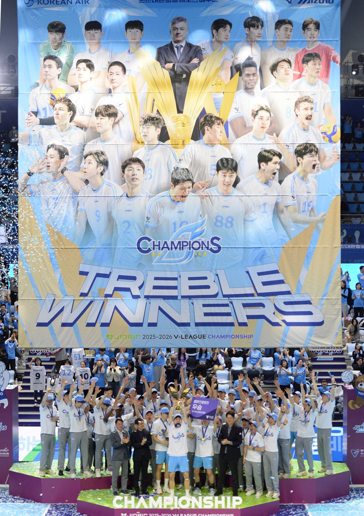 프로배구 대한항공이 10일 인천 계양체육관에서 열린 2025-2026 V-리그 남자부 챔피언결정전 대캐피탈과 경기에서 승리, 우승을 차지하며 환호하고 있다.