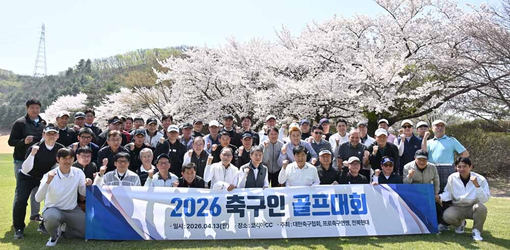 13일 경기도 용인 코리아CC에서 열린 '2026 축구인 골프대회'에서 참가선수들이 기념촬영을 하고 있다.