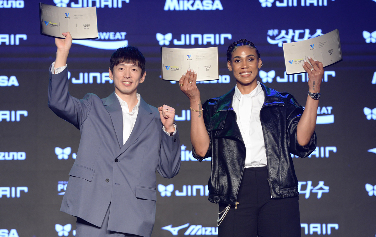 프로배구 대한항공의 한선수(왼쪽)와 GS칼텍스의 실바가 13일 광진구 비스타 워커힐서울에서 열린 '진에어 2025~2026 V-리그 시상식'에서 MVP를 수상한 뒤 포즈를 취하고 있다. 2026.04.13.