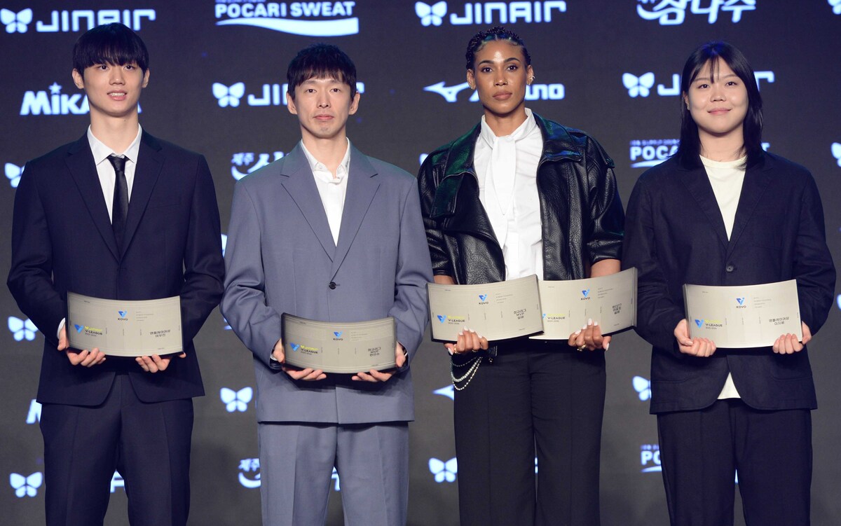 프로배구 삼성화재의 이우진,대한항공의 한선수, GS칼텍스의 실바, 한국도로공사 이지윤(왼쪽부터)이 13일 광진구 비스타 워커힐서울에서 열린 '진에어 2025~2026 V-리그 시상식'에서 영플레이어상과 MVP를 수상한 뒤 포즈를 취하고 있다. 2026.04.13.