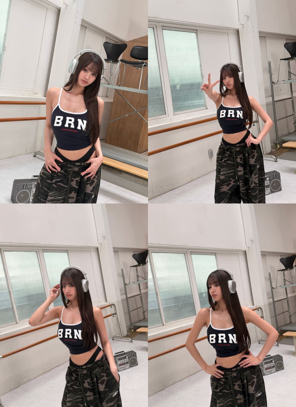 가장 시선을 모은 포인트는 허리 라인 스타일링이다. 바지 위로 속옷 라인을 살짝 드러내는 과감한 연출로 자칫 평범할 수 있는 운동복 차림을 세련되게 완성했다. 여기에 커다란 은색 헤드셋과 클래식한 카세트 오디오를 소품으로 활용해 옛날 감성이 물씬 풍기는 분위기를 더했다.