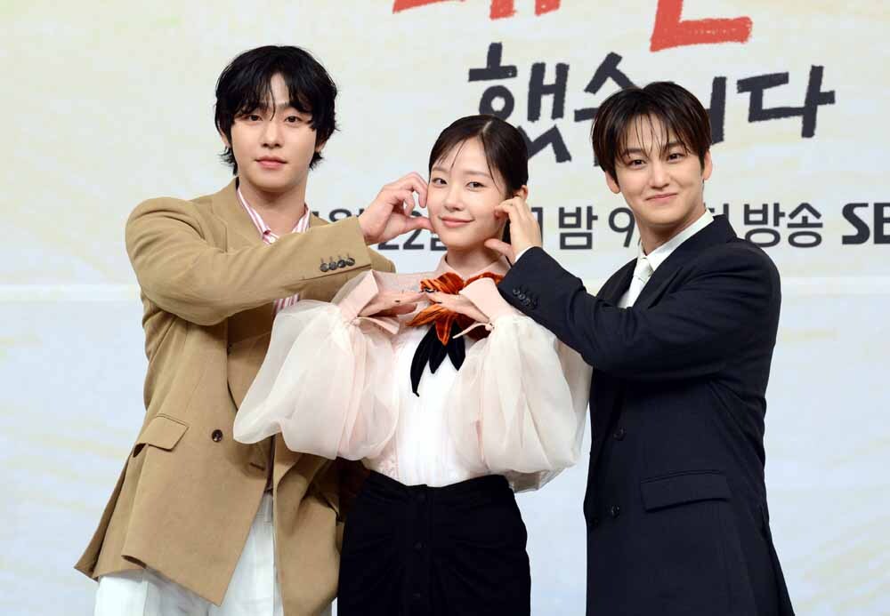 배우 안효섭, 채원빈, 김범(왼쪽부터)이 15일 서울 양천구 SBS 본사에서 진행된 SBS 수목드라마 '오늘도 매진했습니다' 제작발표회에서 포즈를 취하고 있다. SBS 수목드라마 '오늘도 매진했습니다' 는 완벽주의 농부 매튜 리와 완판주의 쇼호스트 담예진이 밤낮없이 얽히며 펼지는 로맨스 드라마로 안효섭, 채원빈, 김범 등이 출연한다. 사진=김두홍 기자 kimdh@sportsworldi.com