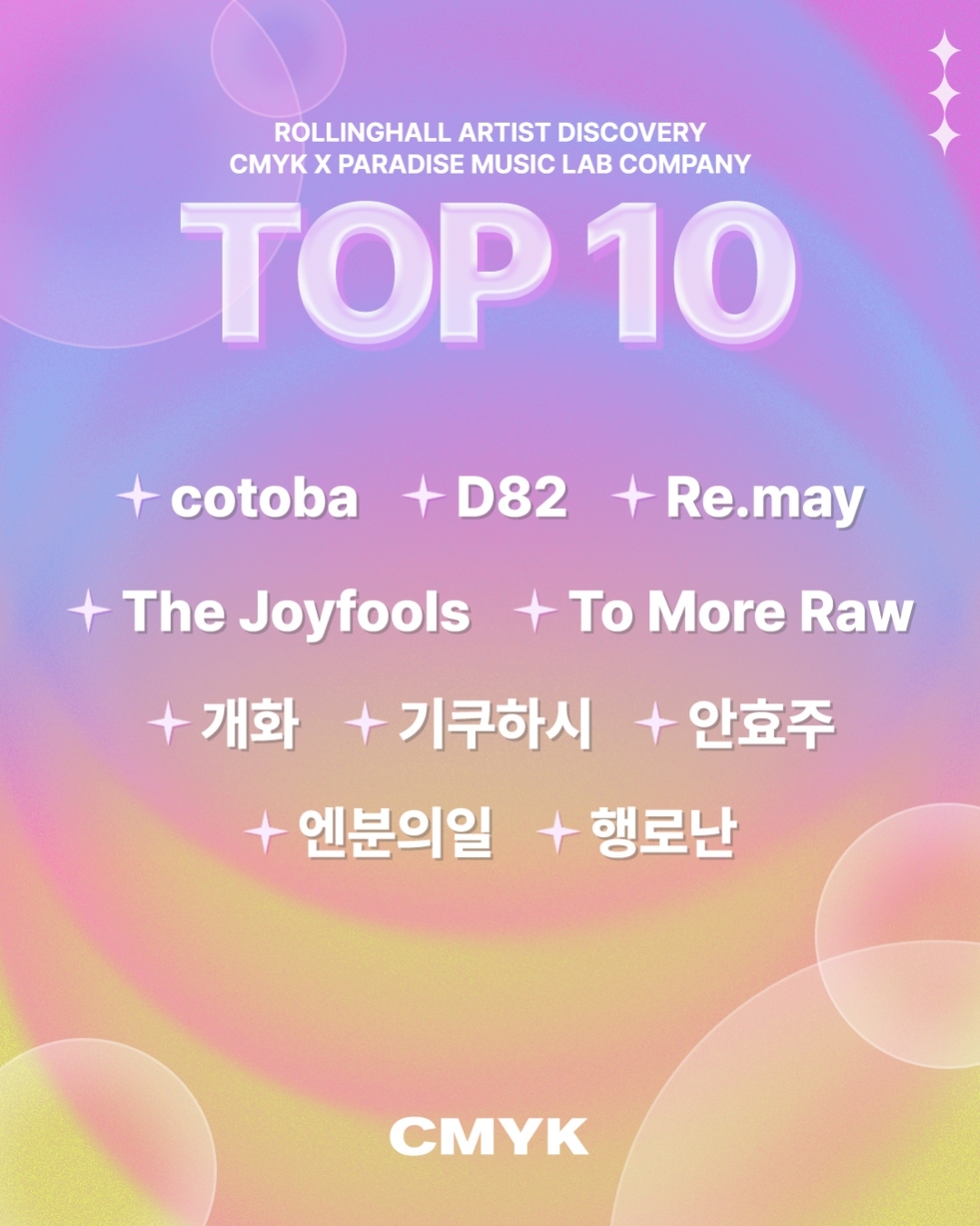 음악의 성지 롤링홀이 파라다이스 뮤직 랩 컴퍼니와 함께 개최한 신인 뮤지션 발굴 프로젝트 ‘CMYK 2026’의 본선 TOP10을 발표했다.