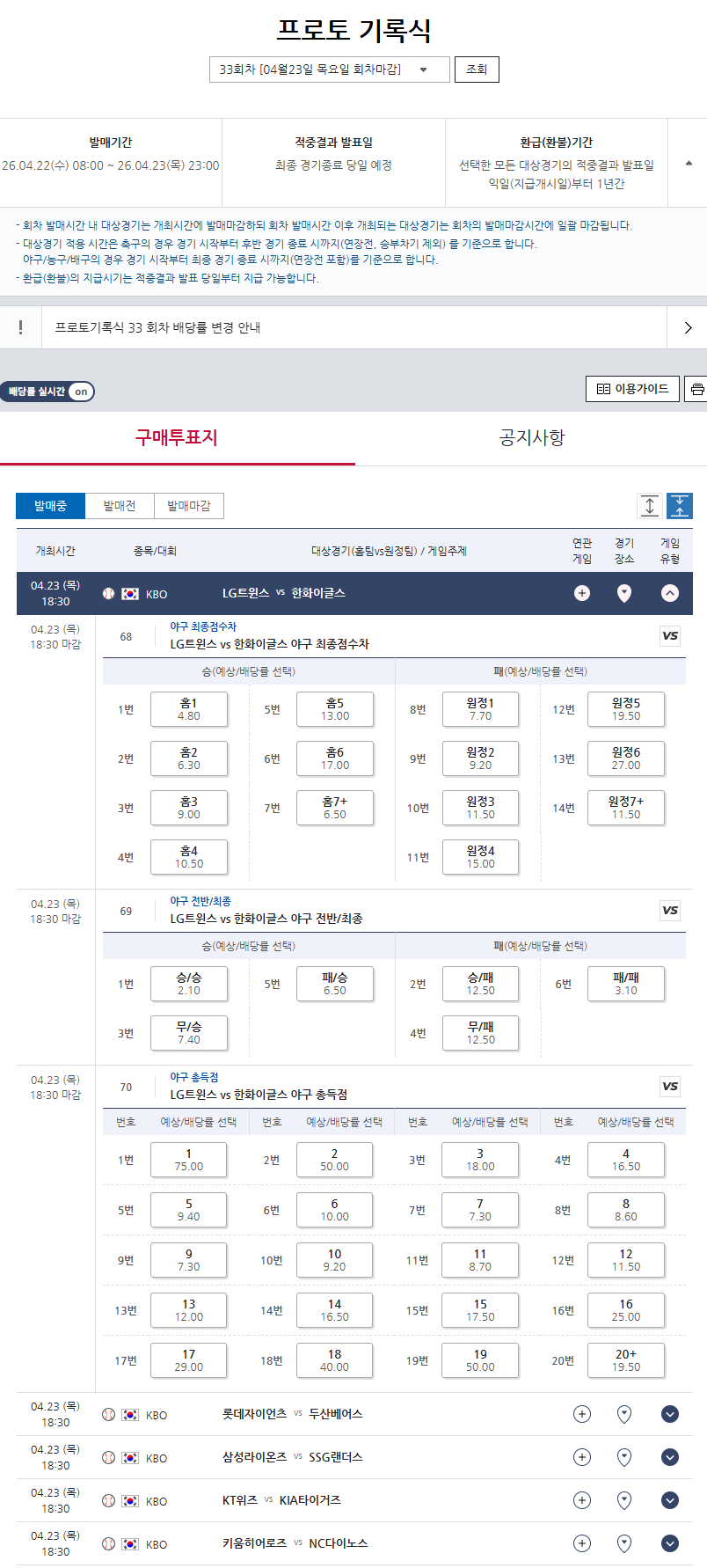 프로토 기록식에 야구 신규 유형 2종이 도입된다. ‘전반/최종’, ‘총득점 맞히기’ 유형을 선택할 수 있다.