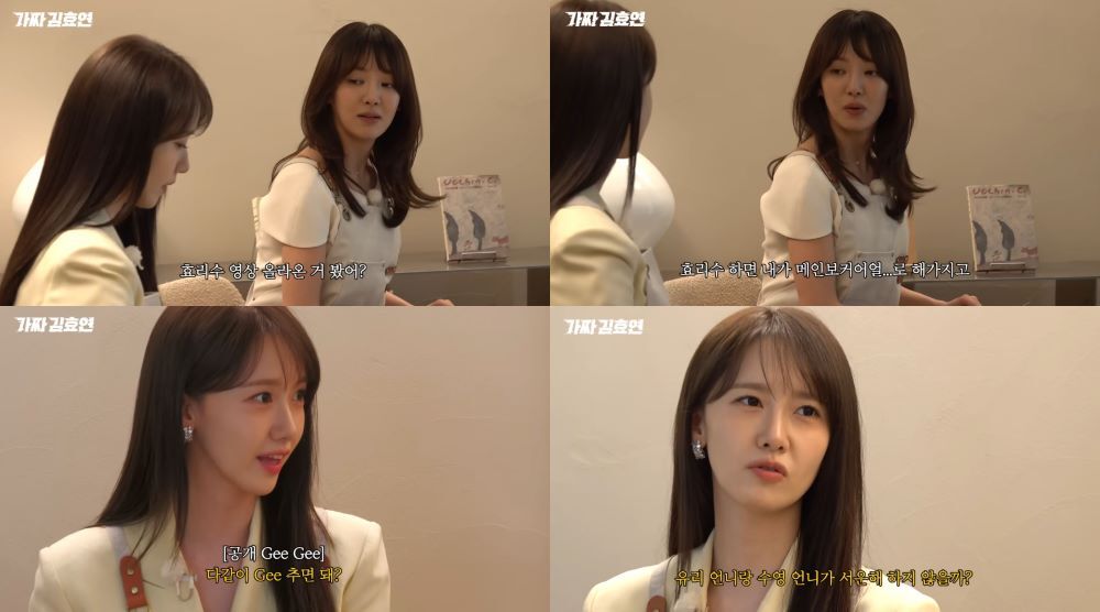 효연은 윤아에게 친근한 인사를 건네며 “효리수 활동에 있어 윤아가 나를 공개 지지해 줬으면 좋겠다”고 본론을 꺼냈다. 이에 윤아는 소녀시대의 히트곡 ‘Gee’를 재치 있게 인용한 “공개 Gee Gee Gee?”라는 말과 함께 노래를 흥얼거리며 잘못 들은 척 장난스럽게 응수했다. 효연은 윤아의 엉뚱한 반응에 농담 섞인 경고를 날리며 현장을 웃음바다로 만들었다.