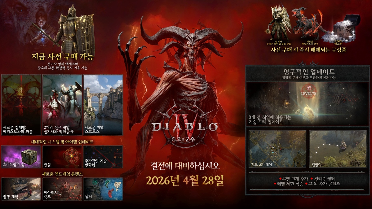 블리자드 엔터테인먼트는 디아블로 IV의 차기 확장팩 ‘증오의 군주(Lord of Hatred)’를 오는 28일 출시한다며, 오프닝 시네마틱부터 오리지널 트랙, 한정판 콜라보 제품까지 확장팩 출시 전반에 걸친 주요 활동들을 24일 공개했다.