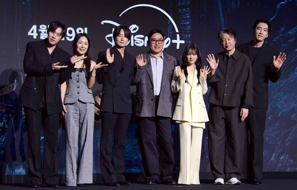 배우 김성철, 문정희, 이현욱, 김성훈 감독, 배우 박보영, 김희원, 이광수(왼쪽부터)가 27일 서울 영등포구 콘래드 호텔에서 진행된 디즈니+ 오리지널 시리즈 '골드랜드' 제작발표회에서 포즈를 취하고 있다.