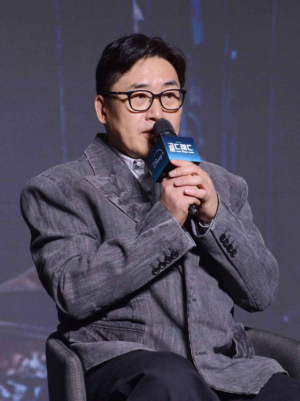 김성훈 감독이 27일 서울 영등포구 콘래드 호텔에서 진행된 디즈니+ 오리지널 시리즈 '골드랜드' 제작발표회에서 질문에 답하고 있다.