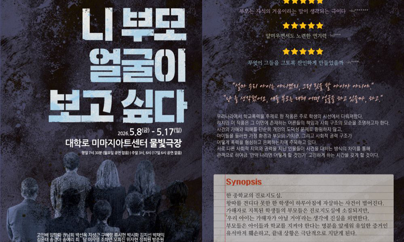 지공연 협동조합의 열두 번째 공연인 ‘니 부모 얼굴이 보고 싶다’가 오는 5월 8일부터 17일까지 대학로 미미지아트센터 물빛극장에서 공연된다. 이번 작품은 학교 폭력이라는 무거운 화두를 통해 어른들의 책임과 선택, 그리고 도덕적 파산을 날카롭게 조명한다.