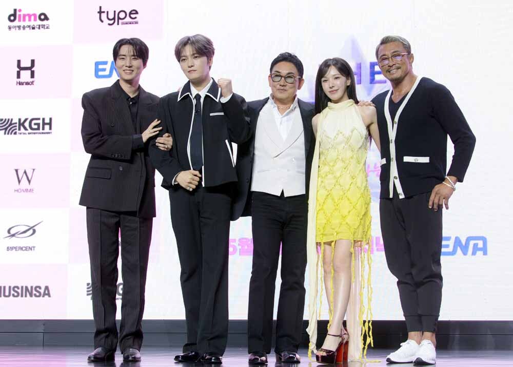 가수 영케이, 김재중, 이승철, 웬디, 방송인 추성훈(왼쪽부터)이 29일 서울 마포구 큐브컨벤션센터에서 진행된 ENA '더스카웃:다시 태어나는 별' 제작발표회에서 포즈를 취하고 있다.